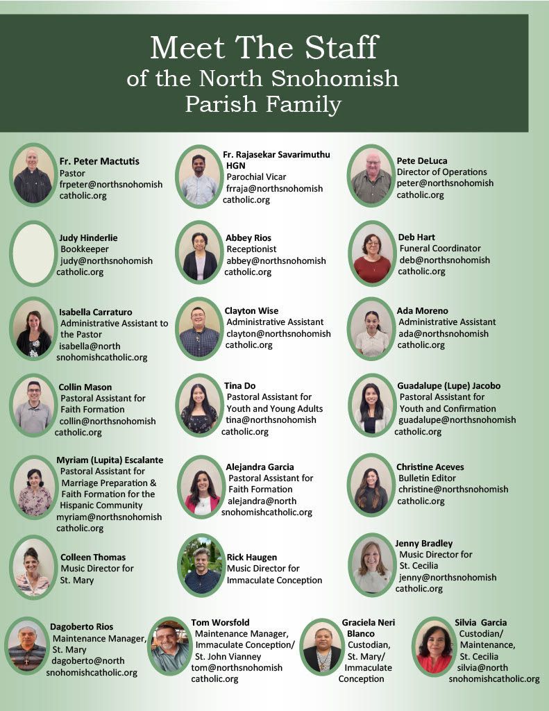 We welcome your call or email to any member of our parish staff. Or if you prefer, you may contact us using our online Contact Form.